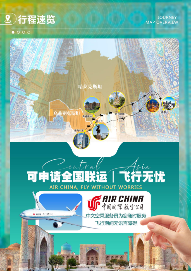 交通:乌鲁木齐→塔什干(飞机);阿拉木图→成都(飞机);奇姆肯特→阿拉木图(火车软卧)