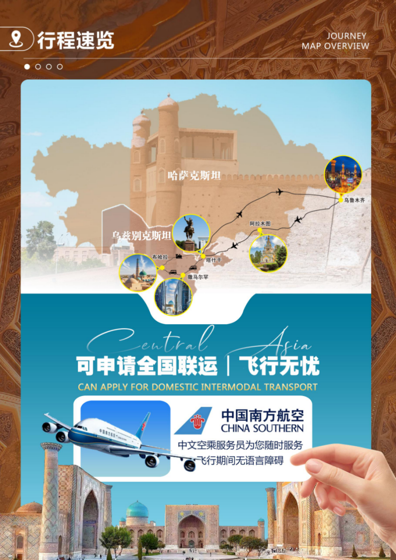 交通:乌鲁木齐→阿拉木图 阿拉木图→塔什干 塔什干→乌鲁木齐 (三段飞机含税);布哈拉→塔什干(高铁)