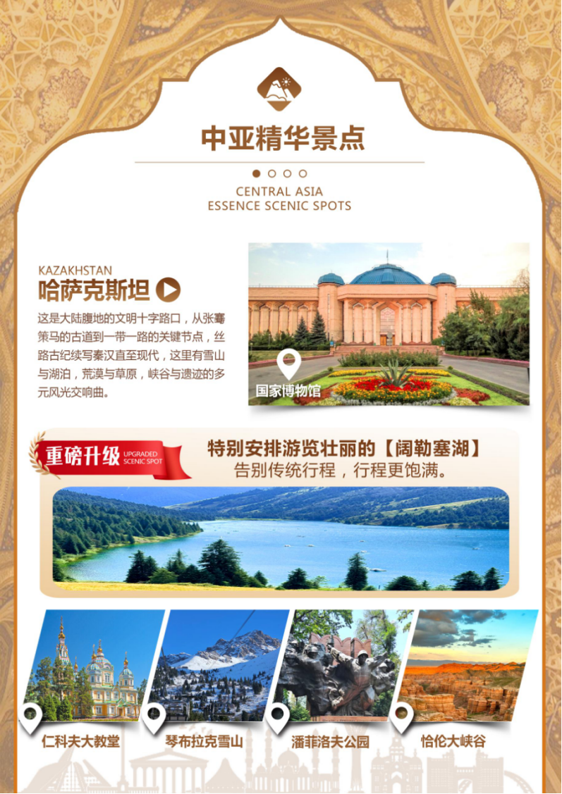 温馨提示:今日打卡恰伦大峡谷与科尔赛湖双景,因路程以及游览时间较长,返回阿拉木图市区时间较晚,当天晚餐安排简餐。