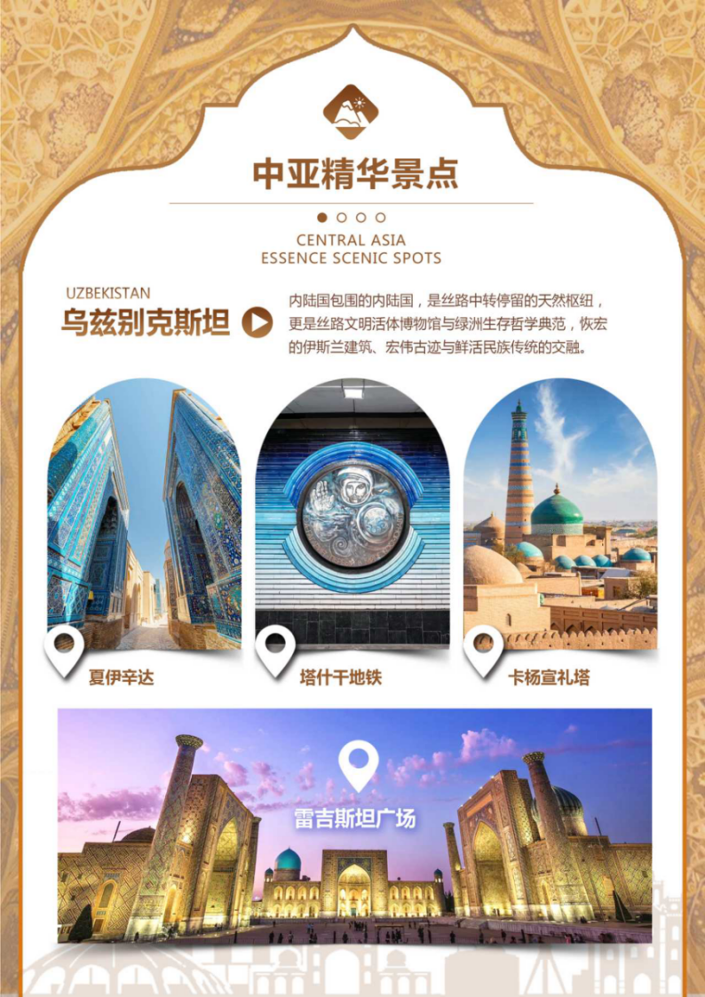 【撒马尔罕】是乌兹别克斯坦的“心脏”,拥有超过2500年的历史,被誉为“丝绸之路的十字路口”。它不只是一座城市,更是一个流淌着青金石与黄金色彩的传奇,是帖木儿帝国的辉煌都城,世界文化遗产的宝库。这里是亚历山大大帝、玄奘法师、成吉思汗都曾踏足的土地。波斯、印度、蒙古、突厥与中国文化在此碰撞融合,成就了独一无二的撒马尔罕文明。
