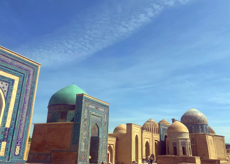 【夏伊辛达陵墓群】(游览时间约60分钟)位于撒马尔罕城郊,由20多座精美陵墓组成的壮丽建筑群,被誉为“永生王之墓”。穿过一条由两侧贴满华丽蓝色瓷砖的陵墓组成的狭窄主道,仿佛漫步在通往天国的蓝色阶梯,视觉效果震撼心灵。据传安葬着先知穆罕默德的堂兄库萨姆·伊本·阿巴斯,以及帖木儿家族的王妃、学者和圣裔,充满神圣与哀荣之美。每一座陵墓的釉面砖装饰都独一无二,花纹复杂,色彩以青蓝色为主,是研究14-15世纪中亚建筑装饰的露天博物馆。