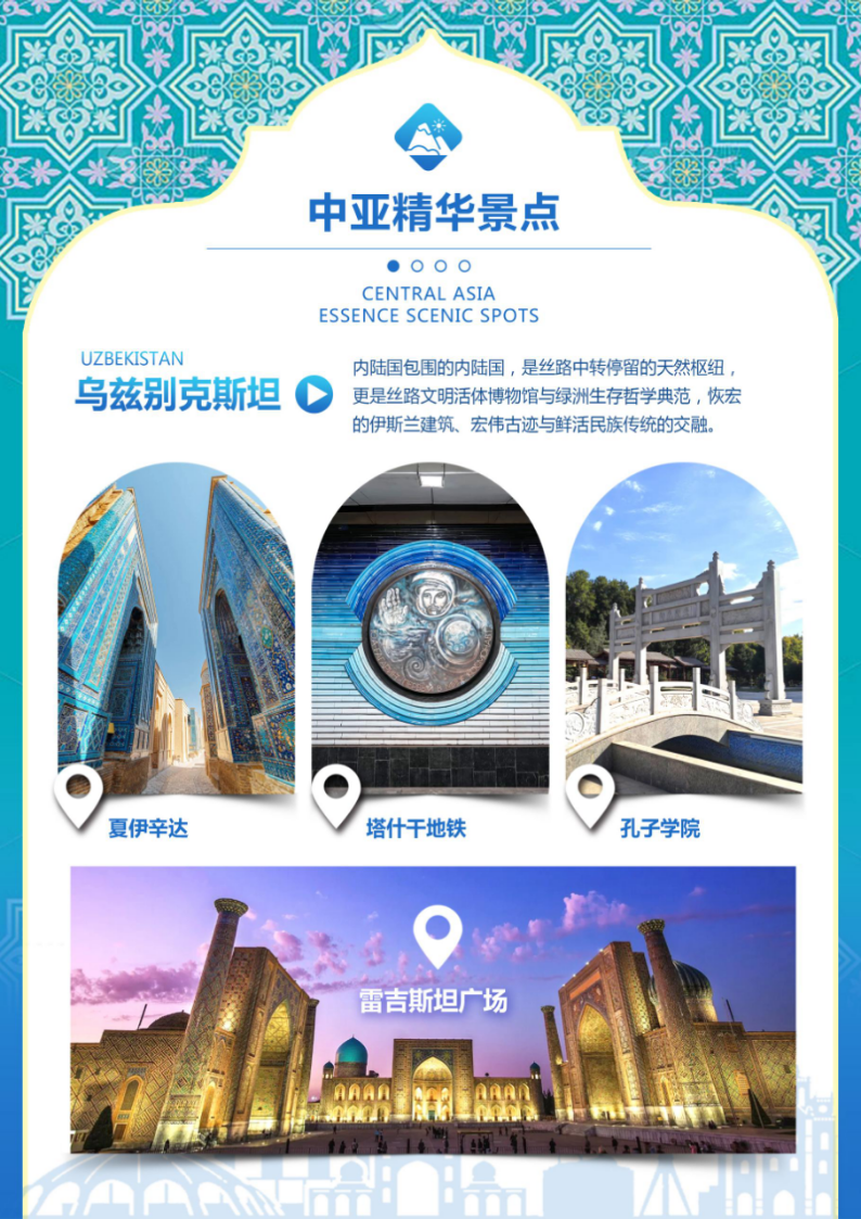 蓝色瓷砖拼出的中亚最美的【夏伊辛达】 (游览时间约40分钟) 游乌兹别克斯坦,不能不到被亚历山大大帝赞为“辉煌之城”的撒马尔罕。而到了撒马尔罕,更不可错过夏伊辛达。夏伊辛达是被公认的乌兹别克斯坦乃至整个中亚的“最美”。夏伊辛达的建筑不仅美得令人心碎,它背后的阿夫罗夏卜山更连接起撒马尔罕这颗“丝路明珠”和中国的悠远历史。夕阳西下时分,流金的暮色将蓝瓷穹顶染出夺目的光彩,让人不由从内心发出叹息,任自己放空大脑和内心,任镜头不停移动咔嚓,也难以全部记录下这儿的美。
