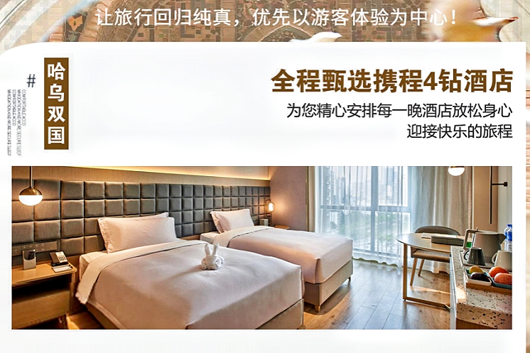 品质住宿:全程甄选酒店(含境外段8晚携程4钻酒店)给您舒适的旅程!